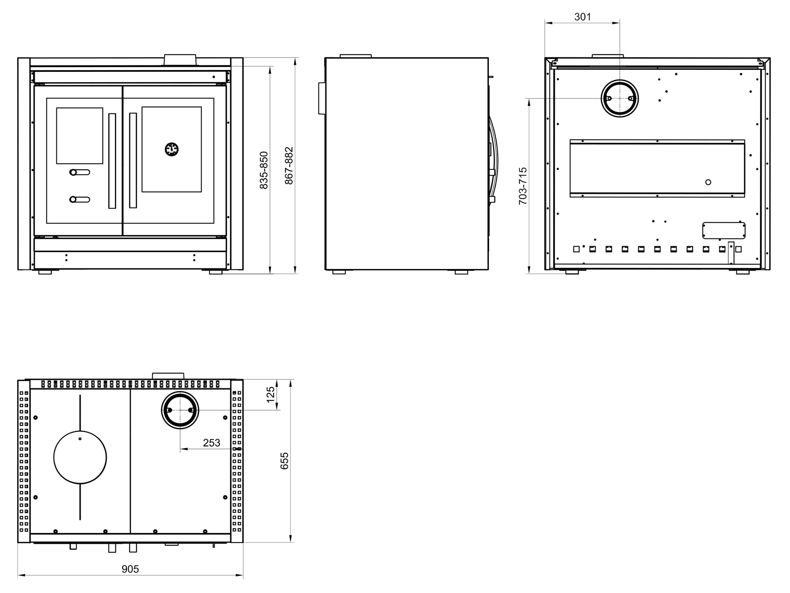 - Maße des Brennraums: (B x H x T in mm): 250 x 315 x 380