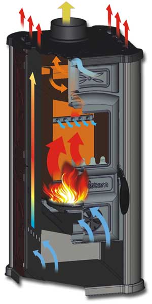 Der „Friedrich“ erwärmt den Raum sowohl durch direkte Strahlungswärme als auch durch einen Warmluftstrom. Unten im Ofen wird Luft in die Konvektionsluftschächte eingesaugt. Die Luft strömt an der heißen Verkleidung des Feuerraums sowie an diversen Wärmeableitblechen vorbei und wird erhitzt. Der warme Luftstrom steigt empor und strömt oben aus den Schlitzen heraus in den Wohnraum.